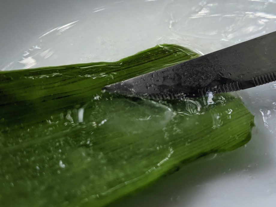 1. Wash your hands and make sure the cutting board and knife or spoon you use are clean to avoid contamination. To obtain the aloe vera gel, cut the bigger leaves from your plants, and carefully cut open with a knife, and scrape out the gel-like substance.