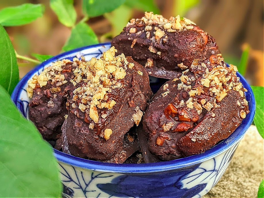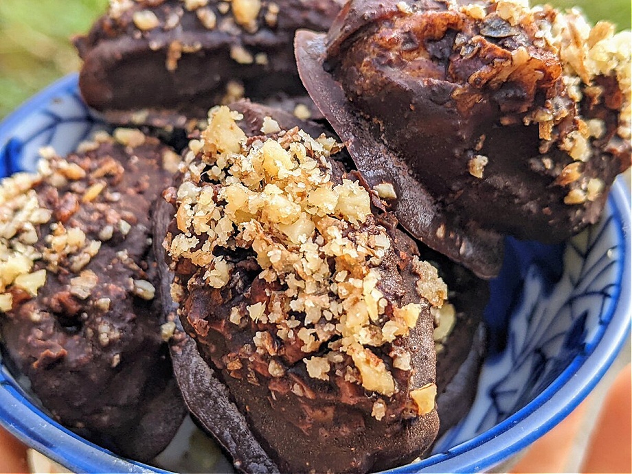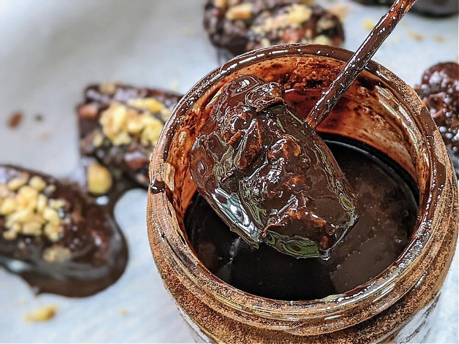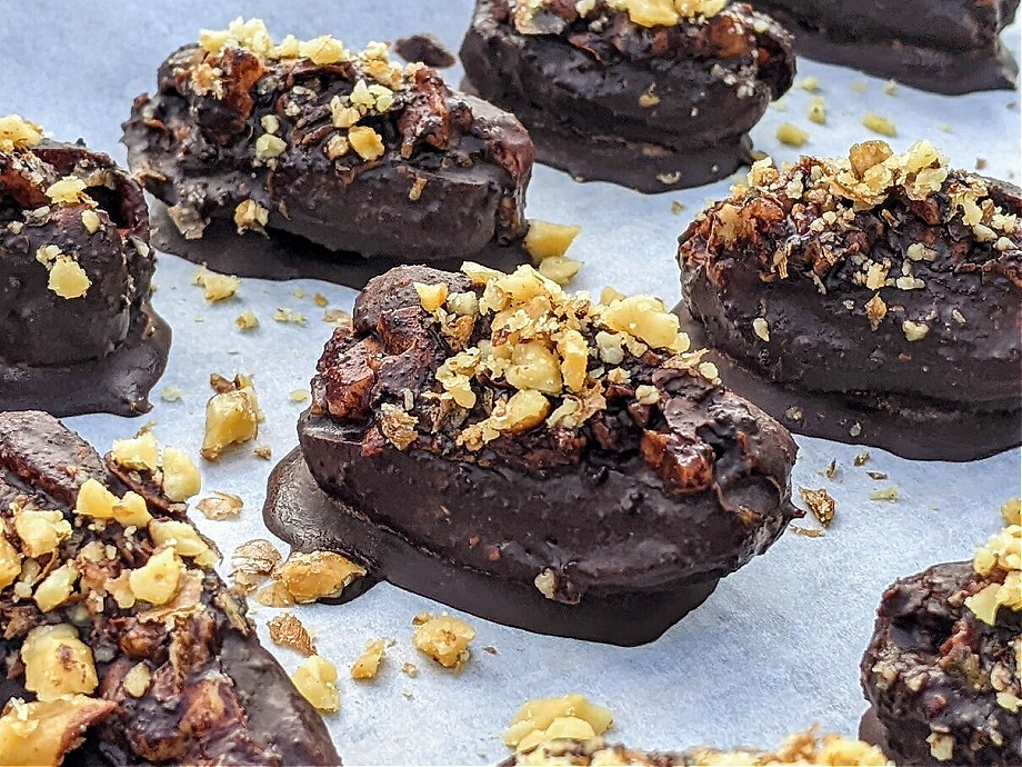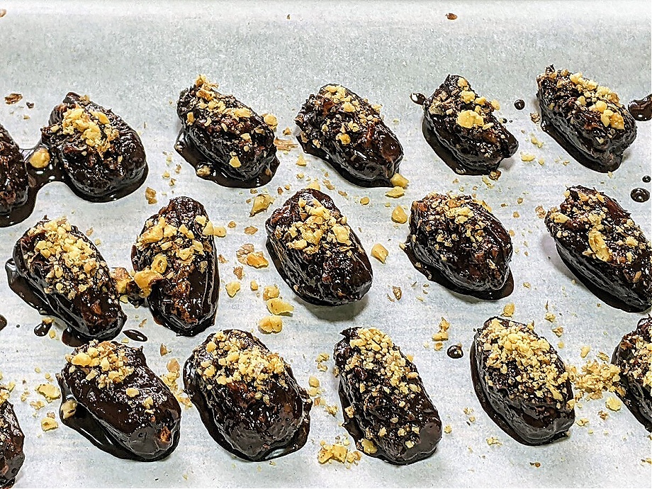 Using a toothpick or skewer, dip each date into the chocolate sauce until completely covered. Place the on a tray lined with parchment paper. Sprinkle with some extra crushed, roasted walnuts.