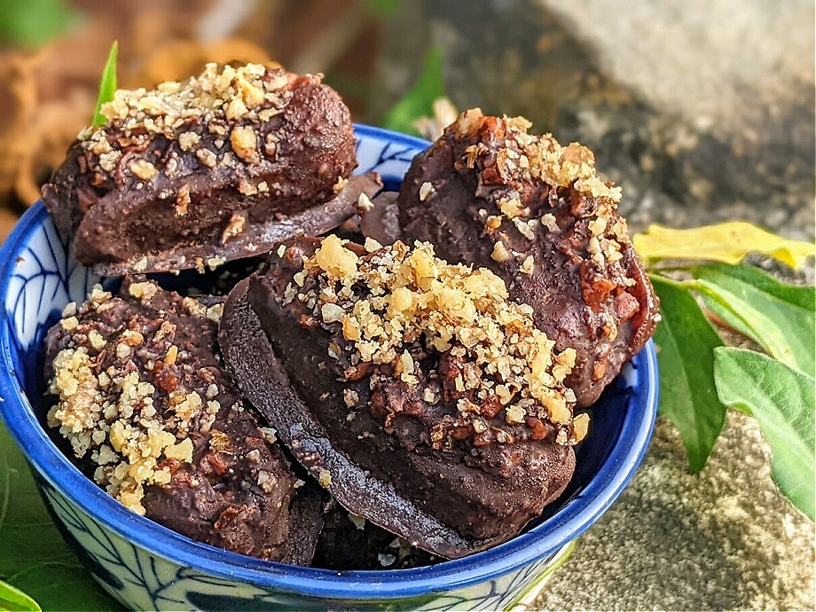 To cover the dates in chocolate, use a toothpick or skewer to dip each date into the chocolate sauce until completely covered. Place the chocolate-covered dates on the tray lined with parchment paper. Sprinkle with some extra crushed, roasted walnuts.