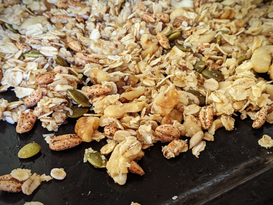 Spread the mixture in a single layer on a baking sheet. Bake for about 10 minutes or until your desired crispiness. Toss regularly while baking.