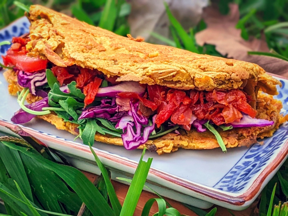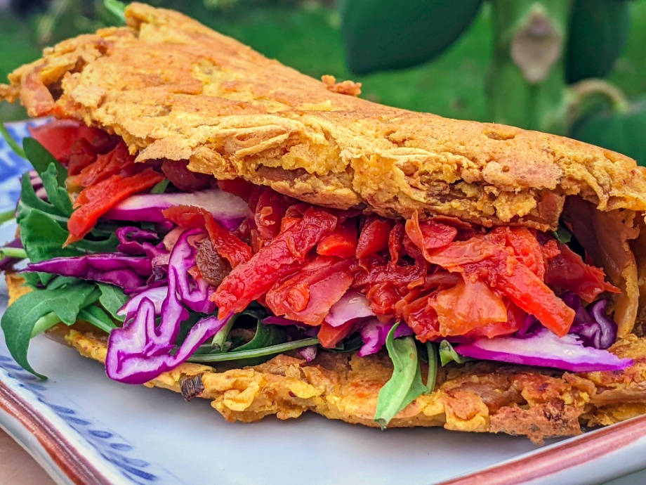 This time we filled our pancake with rocket lettuce, red cabbage, tomatoes, and the beetroot sauerkraut I started making recently.