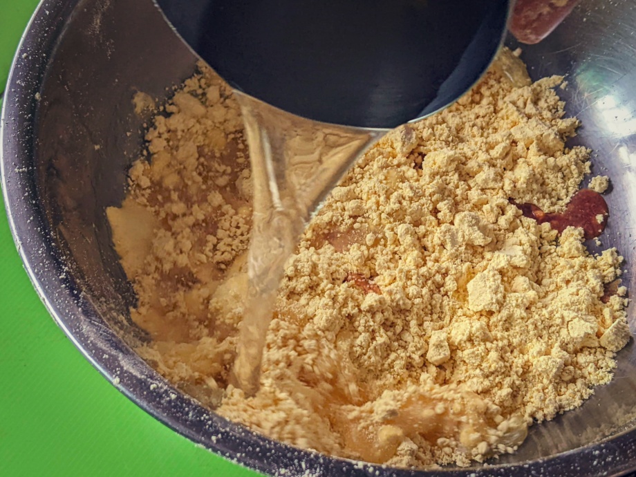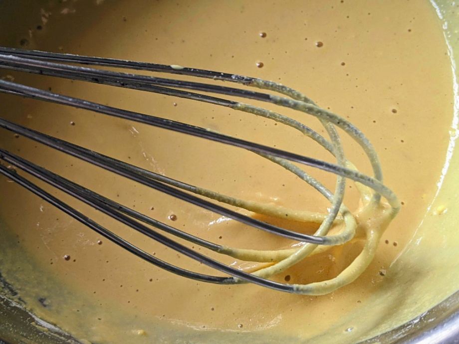 - Whisk together the chickpea flour, kimchi brine, water, baking powder, and pink salt until you have a smooth batter.