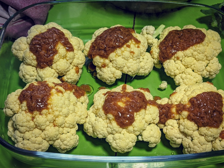 Add the baby cauliflower heads to an oven-safe dish. Mix all miso marinade ingredients in a small bowl. Gently massage the miso marinade into the cauliflower heads.