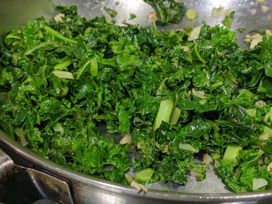 While the cauliflower is roasting, heat cooking oil over medium heat. Saute the garlic for a few seconds and add shredded kale.