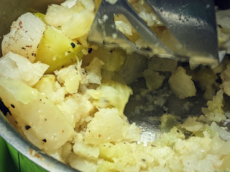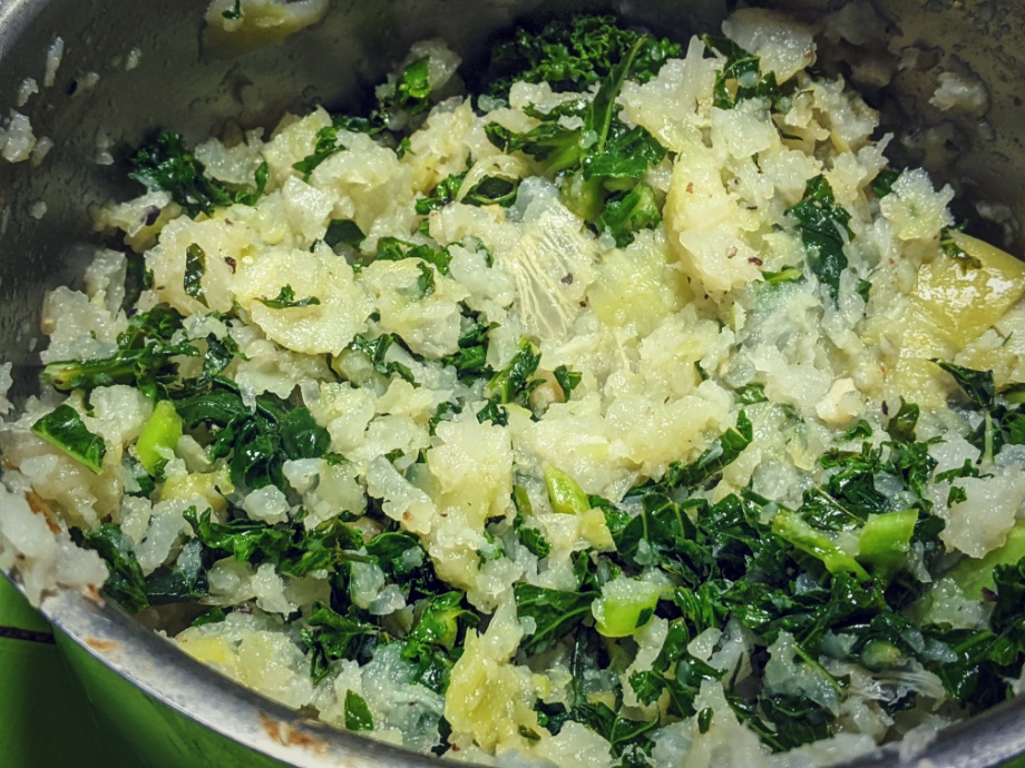 Mash kohlrabi first before adding the cooked kale and a splash of nut milk. Mash again and season with salt, black pepper, and nutmeg to taste.