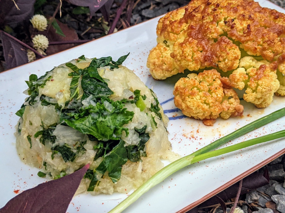 Miso Roasted Cauliflower with Kohlrabi-Kale Mash