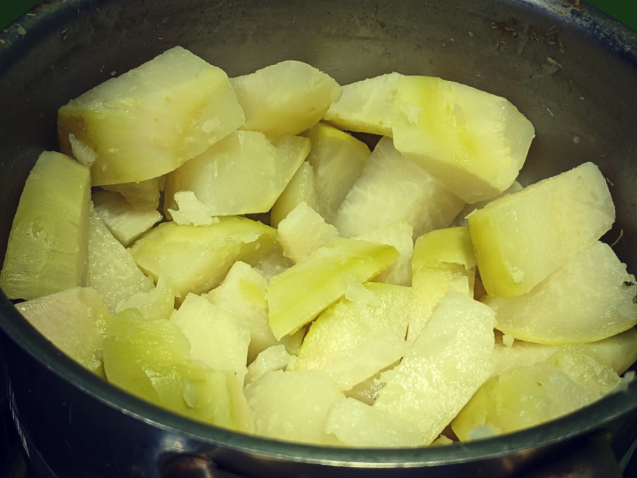 Boil kohlrabi for 25 to 30 minutes or until tender. When ready, drain well. If the kohlrabi is still too wet after, lightly cook for a few seconds on the stove until all water has evaporated. If to much water remains, the mash will be very runny.