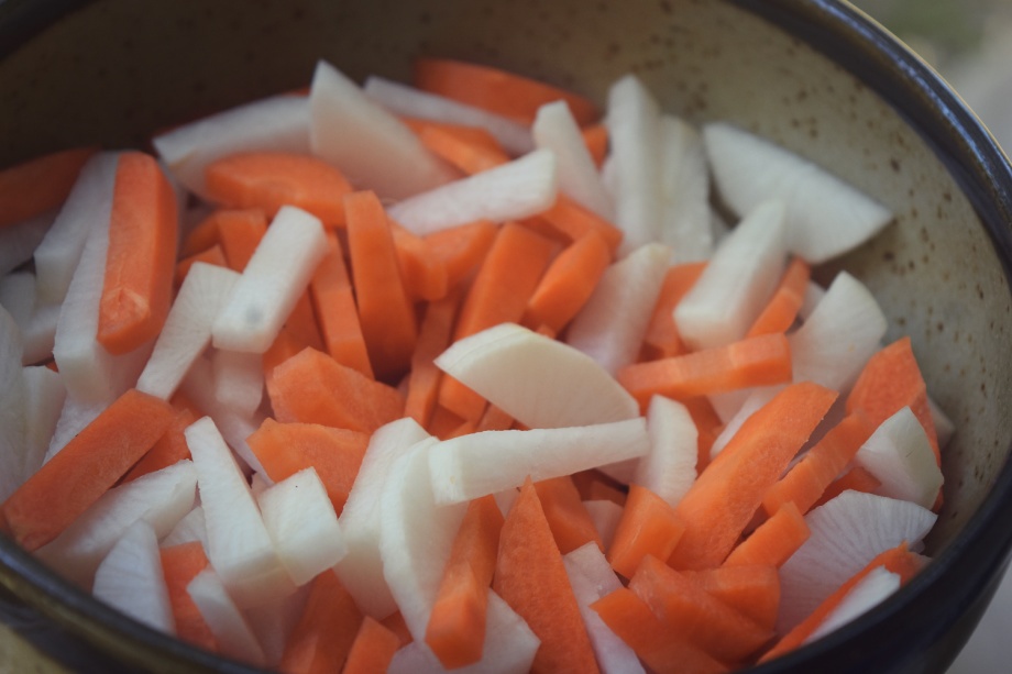 - Saute carrot, Daikon, Chinese cabbage, and leek for a few minutes or until they start to soften.