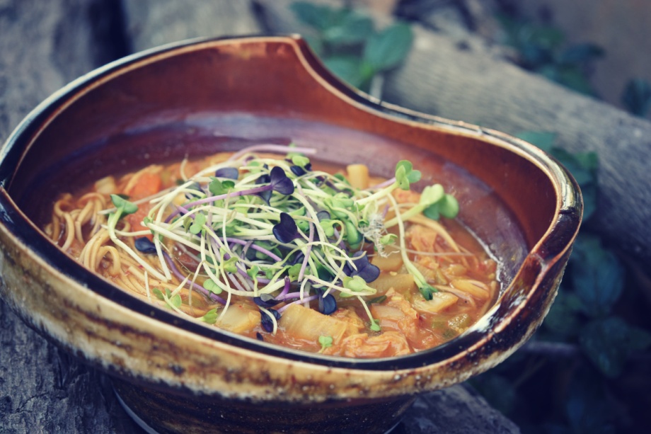 We’ve already talked about the health benefits of buckwheat noodles, but what makes this noodles soup even better is the miso and homemade kimchi.