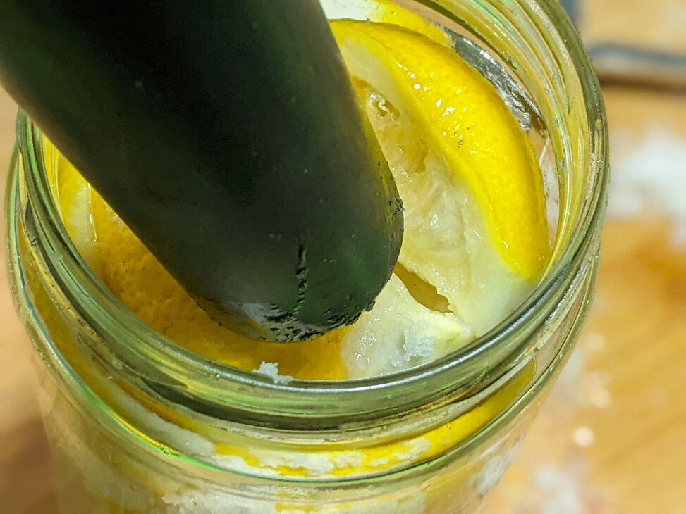 Use a pestle or blender tamper to press down on the lemons so that they release their juice. The juice, combined with the salt, will form a brine that completely covers the lemons. If the lemons do not release enough juice, squeeze some extra lemon juice into the jar.
