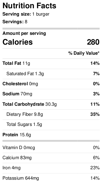 Feel free to double, triple, or even quadruple this recipe. At our home, we always have a few different kinds of veggie burgers in the freezer. Though veggie burgers take some time to prepare, making a bigger batch to freeze will save you valuable time later.