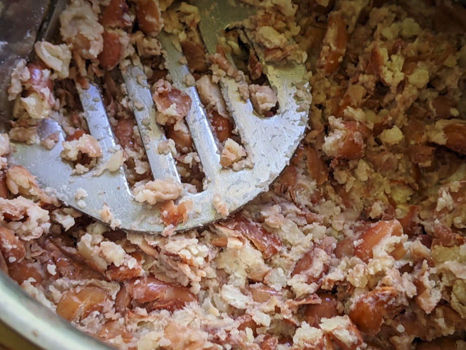 - Using a potato masher, mash the pinto beans. Do not over-mash as you still want to keep some texture in them.