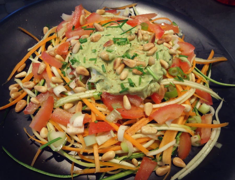 The first veggie pasta I made (see pic below) with my julienne peeler was a zucchini-carrot pasta with fresh tomatoes from my mom’s garden, avocado sauce, and pine nuts.