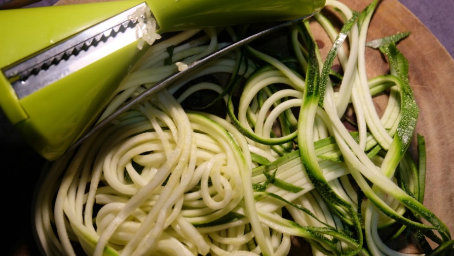 Though I prefer zucchini noodles made with the second hand spiralizer as they don’t tend to lose their shape or go all soggy when cooked, some people prefer flat fettuccine-like pasta strands.