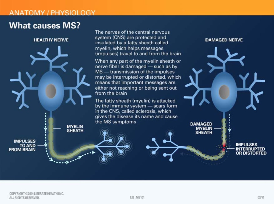For reasons that are still unclear, in people with MS, the body attacks its own fatty insulation material (myelin) that coats and protects nerve fibers in the brain and spinal cord.